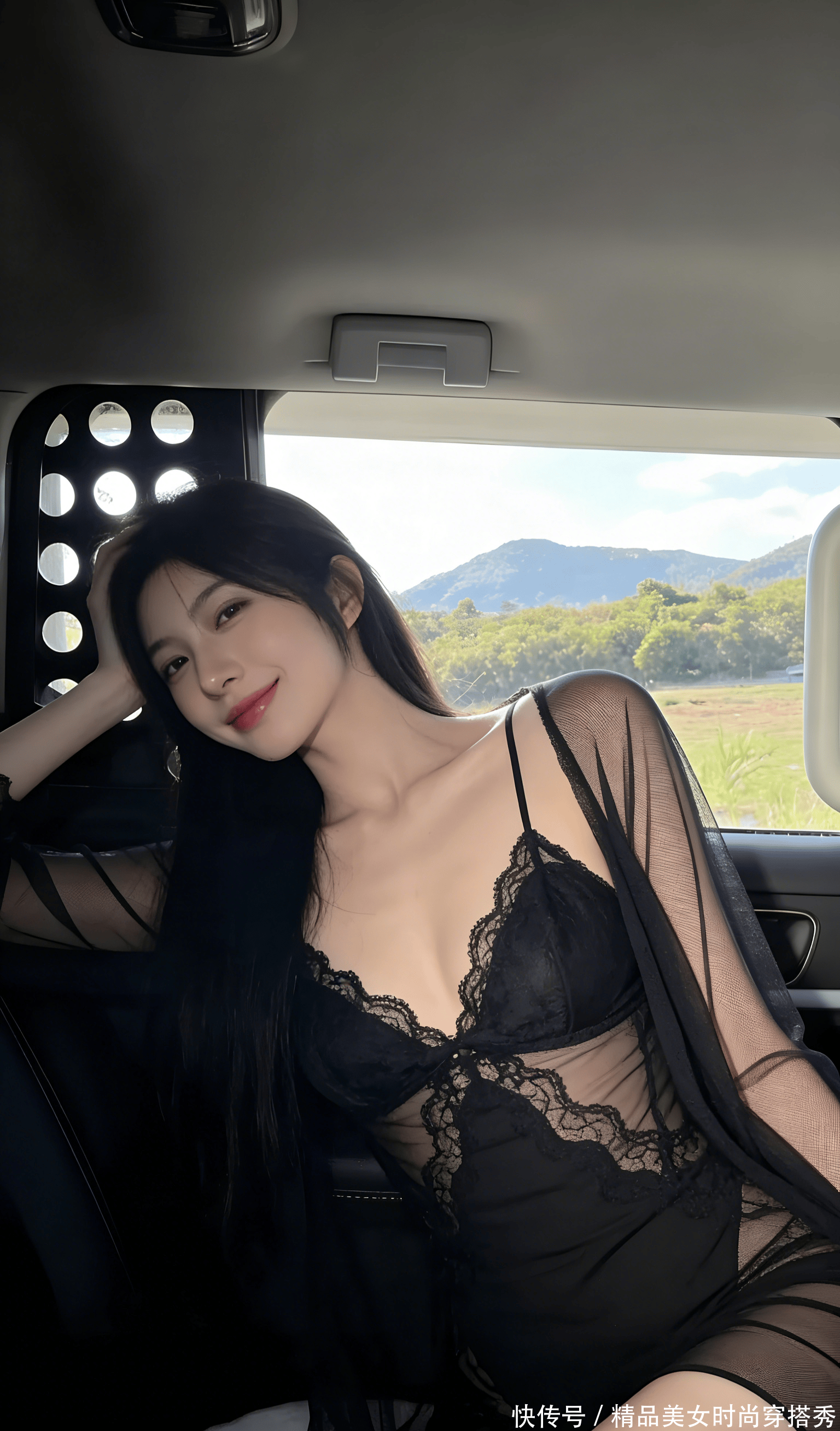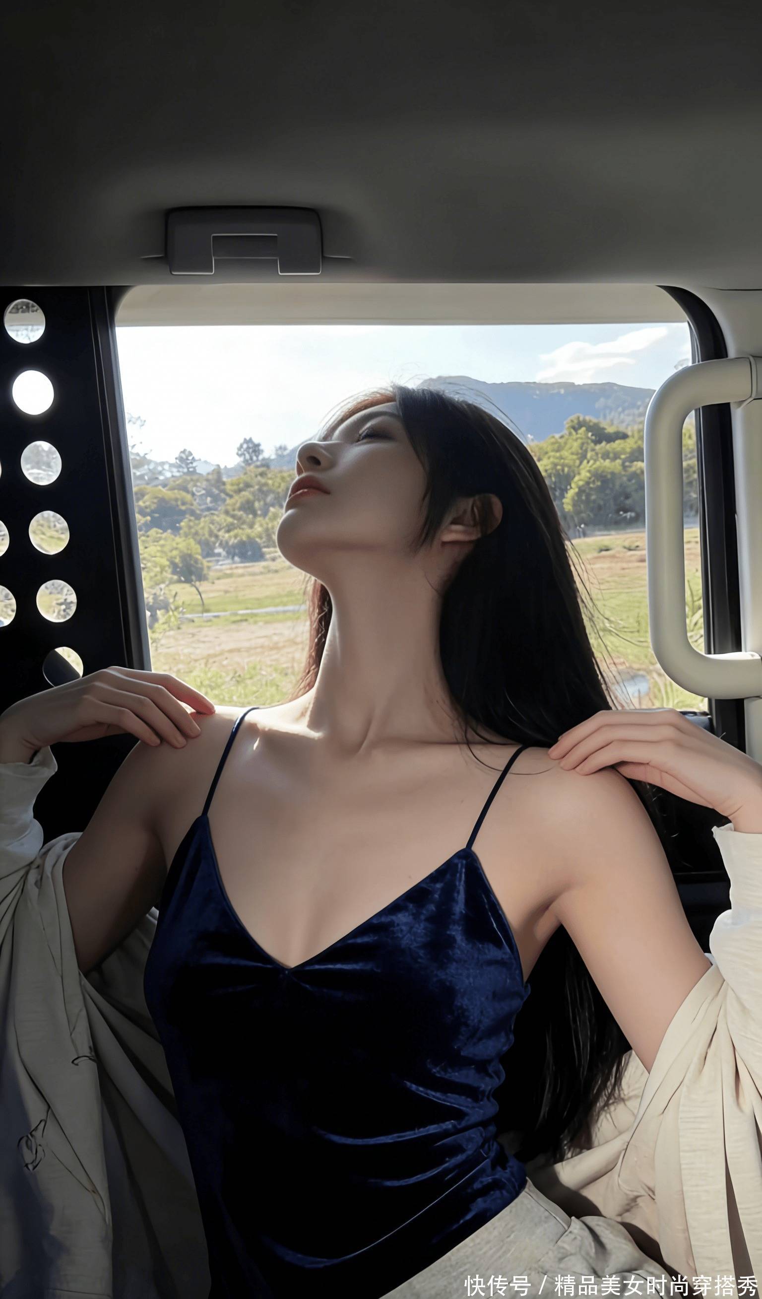 长发垂在肩窝,发梢扫过抹胸的亮片,蹭出细碎的响。她歪头笑时,眼尾扫过车窗的光,睫毛上沾着点郊外的风,像在说 “再躺会儿,反正没人催”。车厢里的暗和窗外的亮撞在一起,把她的影子揉得又软又长,亮片的光在她皮肤上跳,像撒了把碎钻,每晃一下都勾着人心尖。