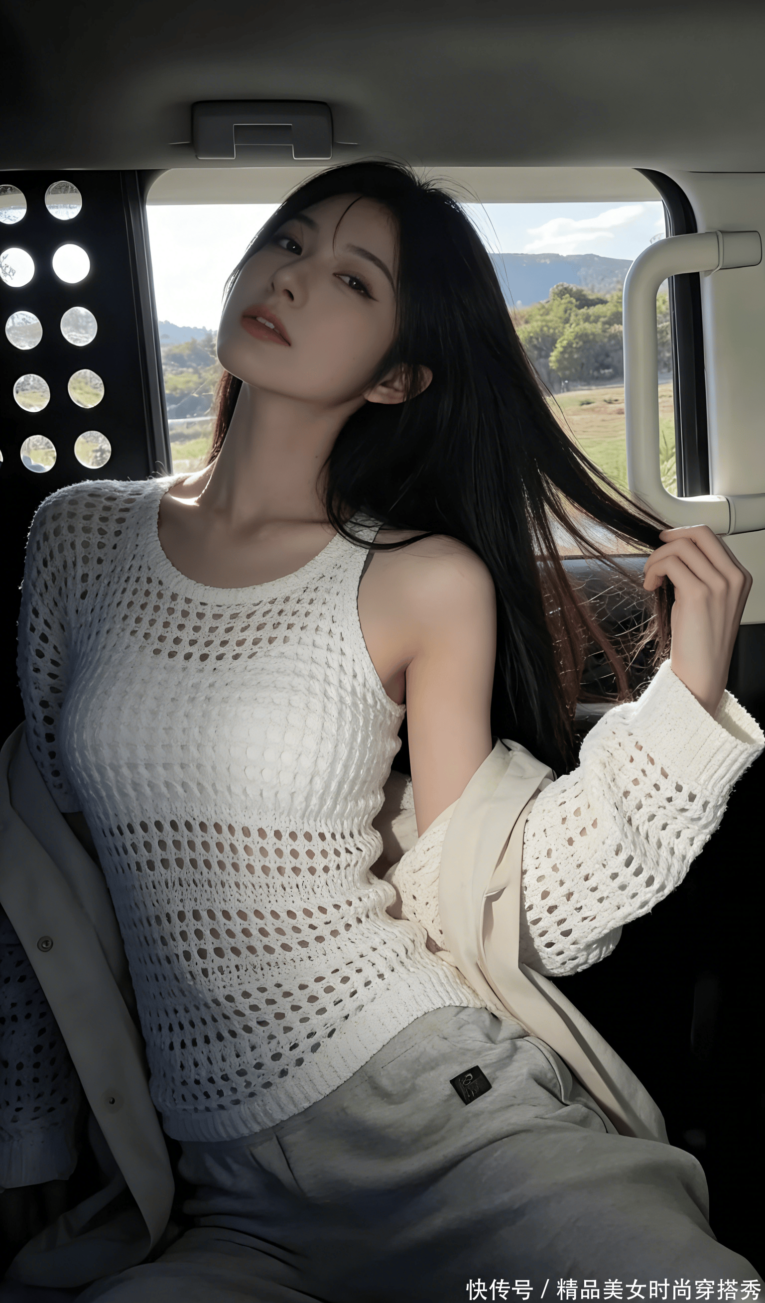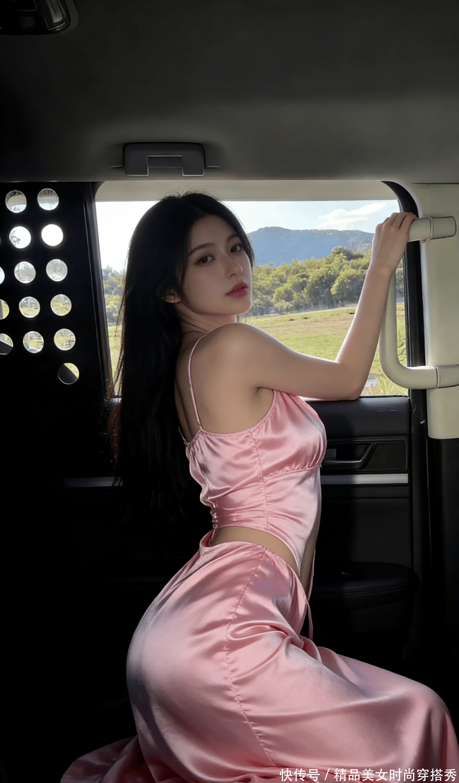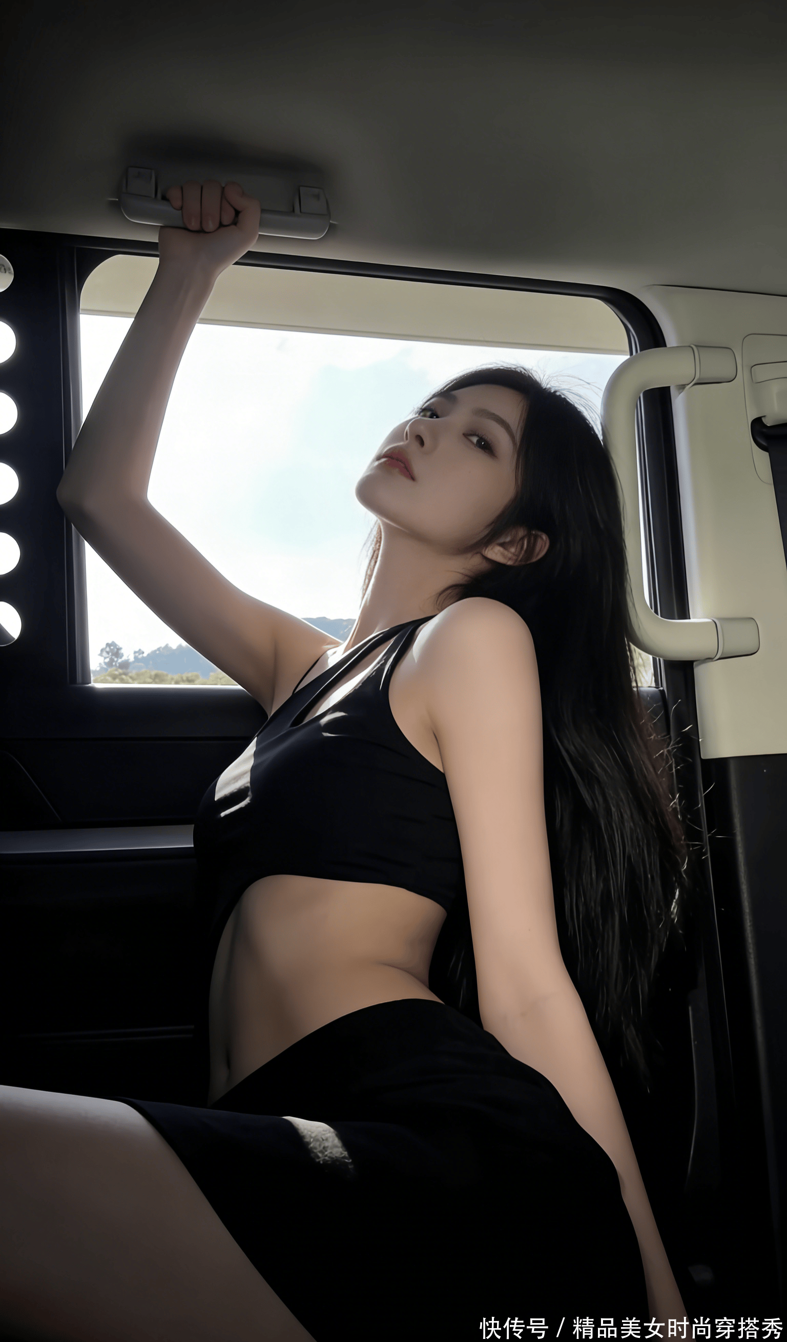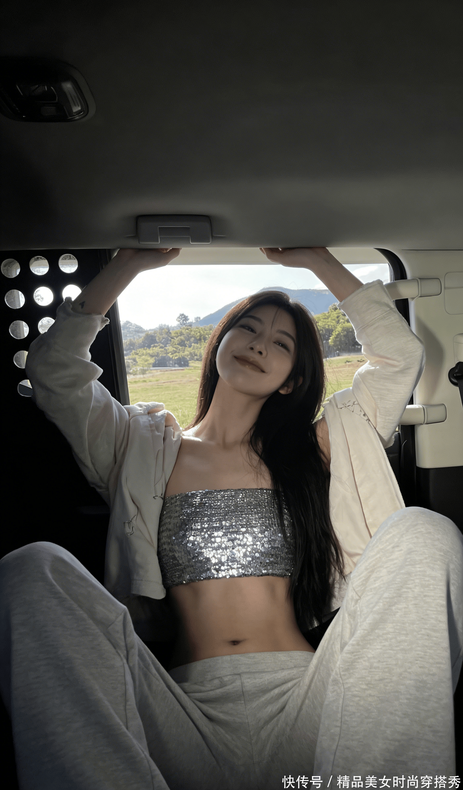 郊外的风撞进半开的车厢,混着青草香,吹得亮片抹胸碎光乱颤。她往车座里一陷,宽松外套滑到臂弯,露出银闪闪的抹胸贴在锁骨下,每片亮片都在偷映着窗外的云。手臂搭在车顶,指节泛着薄粉,像刚摸过沾露的草叶,腰腹的线条在光影里软得像水,宽松运动裤往下滑了点,露出腰窝的浅陷,让人想伸手蹭一蹭,到底是风凉,还是她的皮肤更暖。